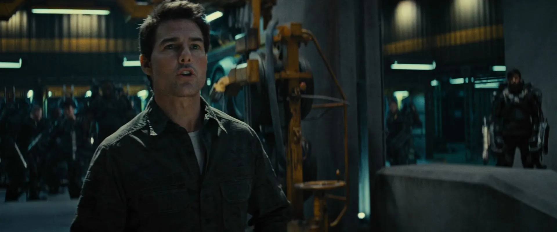 Starring: Tom Cruise as Maj. William 'Bill' Cage, Emily Blunt as Sgt. Rita Vrataski, Bill Paxton as Master Sergeant Farell, Brendan Gleeson as General Brigham, Noah Taylor as Dr. Carter, Kick Gurry as Griff, Dragomir Mrsic as Kuntz, Charlotte Riley as Nance, Jonas Armstrong as Skinner, Franz Drameh as Ford, Masayoshi Haneda as Takeda, Tony Way as Kimmel, Terence Maynard as Cruel Sergeant, Lara Pulver as Karen Lord, Madeleine Mantock as Julie, Assly Zandry as Infirmary Nurse, Sebastian Blunt as Young Soldier / Tarmac, Beth Goddard as Secretary - Judith, Ronan Summers as Dog Soldier 1, Aaron Romano as Dog Soldier 2, Usman Akram as Dog Soldier 3, Bentley Kalu as Dog Soldier 4, Mairead McKinley as Bar Maid, Andrew Neil as Old Man, Martin Hyder as Drunk, Tommy Campbell as Drop Ship Pilot, John Dutton as Old Man 2, Harry Landis as Old Man 3, Rachel Handshaw as Military Spokesperson 1, Martin McDougall as Military Spokesperson 2, Anna Botting as Sky News Anchor (Anna Botting), Jane Hill as BBC News Anchor (Jane Hill), Erin Burnett as CNN News Anchor (Erin Burnett), Dany Cushmaro as Channel 2 News Anchor (Dany Cushmaro), David Kaye as UDF Commercial (voice), Jackson as Refugee Dog, Johnny Otto as Dog Soldier (uncredited), Stuart Matthews as Soldier (uncredited)