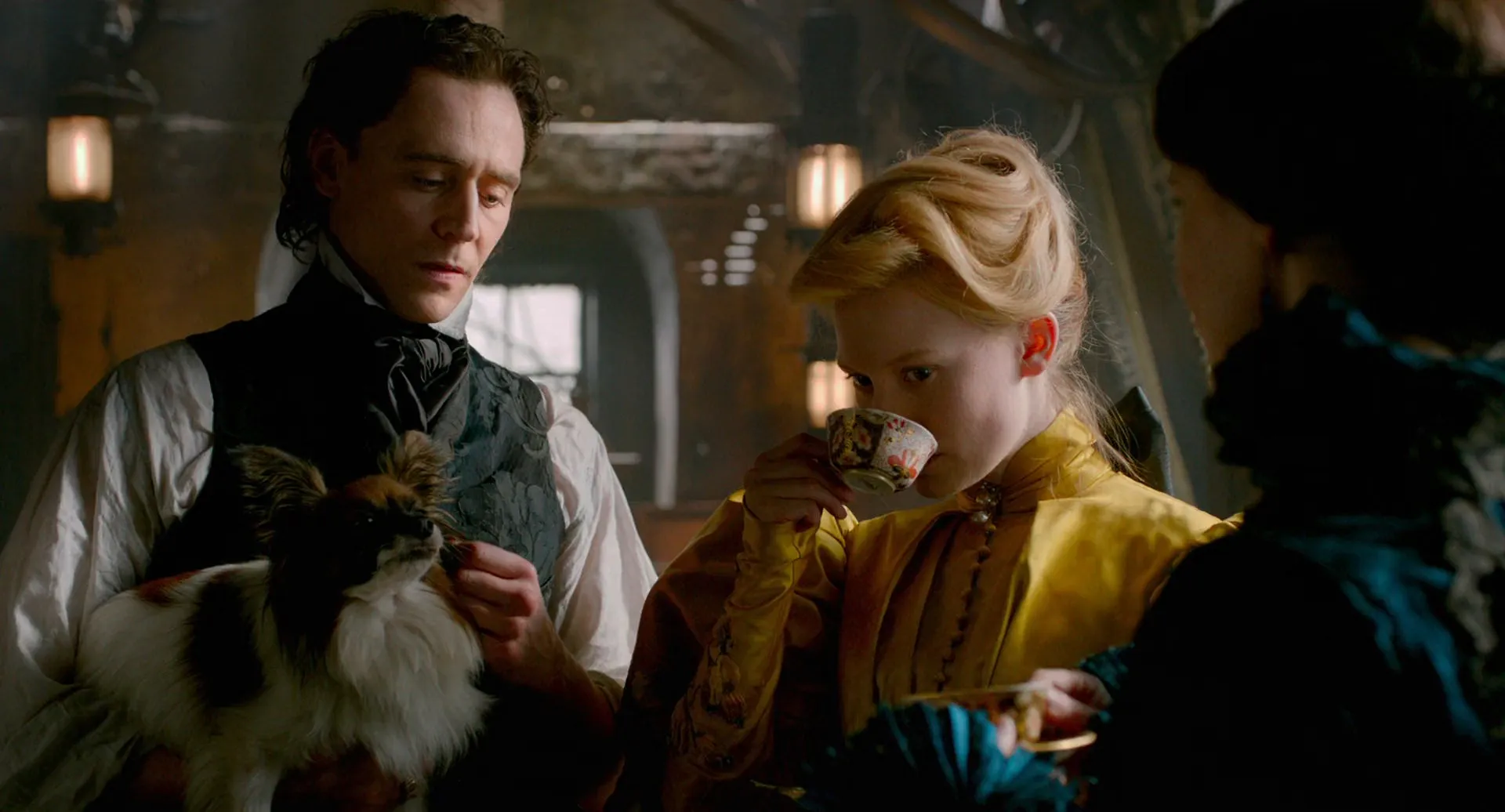 Starring: Mia Wasikowska as Edith Cushing, Jessica Chastain as Lady Lucille Sharpe, Tom Hiddleston as Sir Thomas Sharpe, Charlie Hunnam as Dr. Alan McMichael, Jim Beaver as Carter Cushing, Burn Gorman as Holly, Leslie Hope as Mrs. McMichael, Jonathan Hyde as Ogilvie, Doug Jones as Edith's Mother / Lady Sharpe, Bruce Gray as Ferguson, Emily Coutts as Eunice McMichael, Alec Stockwell as Finlay, Brigitte Robinson as Secretary Jane, Gillian Ferrier as Society Girl, Tamara Hope as Society Girl, Kimberly-Sue Murray as Society Girl, Sofia Wells as Young Edith, Joanna Douglas as Maid Annie, Bill Lake as Coroner, Jim Watson as Shipping Agent, Javier Botet as Enola / Margaret / Pamela, Peter Spence as Manager, Danny Waugh as Club Attendant, Sean Hewitt as Reverend, William Healy as Young Alan, Matia Jackett as Young Eunice, Karen Glave as Maid, Khadijah Roberts-Abdullah as Maid, John Carter Craig as Patient, Martin Julien as Postal Clerk, Brian Kaulback as Vendor, Richard Kerr as Vendor, Shane McPherson as Vendor, Tim Blake as Reverend, Thomas Dorey as Architect, Erik Bauersfield as Additional Voices (voice), Joan Washington as Additional Voices (voice), Beatrice Basso as Additional Voices (voice), Mitzi McCall as Additional Voices (voice), Susanne Blakeslee as Additional Voices (voice), Drew Davis as Additional Voices (voice), T.J. McGibbon as Additional Voices (voice), Anneliese Goldman as Additional Voices (voice), Jenna Weir as Additional Voices (voice), Amanda Smith as Beatrice (uncredited), Laura Waddell as Pamela Upton (uncredited)